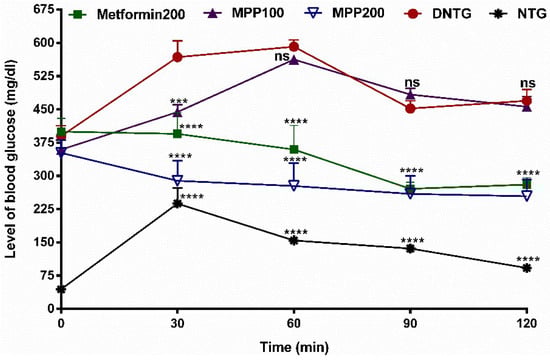 Effects of the oral administration of MPP and metformin on the blood glucose concentration in glucose-loaded diabetic mice. Metformin200: metformin 200 mg/kg bw (positive control); MPP100 and MPP200: 4-methoxychalcone (100 mg/kg and 200 mg/kg bw, respectively). DNTG: untreated diabetic control group. NTG: untreated healthy mice group. Values are expressed as mean ± SD, n = 6. ns = not significant (p > 0.05). The character **** indicates p < 0.0001 and *** indicates p < 0.001 versus the untreated control group (ANOVA followed by Dunnett’s multiple comparison test).