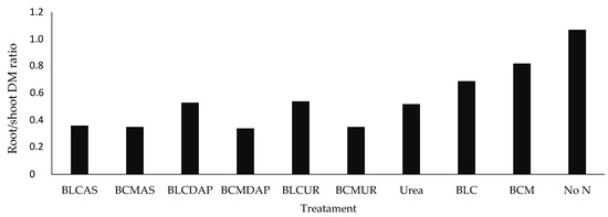 Root/shoot dry matter ratio as a function of the use of urea, pure biochar, and composite as N sources for maize plants. BLCAS = leguminous cake biochar + ammonium sulfate; BCMAS = chicken manure biochar + ammonium sulfate; BLCDAP = leguminous cake biochar + DAP; BCMDAP = chicken manure biochar + DAP; BLCUR = leguminous cake biochar + urea; BCMUR = chicken manure biochar + urea; UREA = positive control with N; BLC = leguminous cake biochar; BCM = chicken manure biochar; No N = negative control, maize cultivated without N.