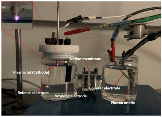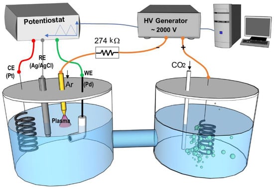 For electrochemical tests without plasma discharge, the experiments were conducted following the standard electrochemical procedure. In electrochemical tests involving direct current (DC) plasma, the plasma jet was connected to the negative pole of a high-voltage supply (PS325 2500 V; 25 W, Stanford Research Systems, Sunnyvale, CA, USA), relative to a submerged Pt electrode in the other chamber. The plasma was ignited at 2.5 kV, with a 274 kΩ ballast resistor limiting the plasma current. The left chamber’s headspace was filled with Ar gas through the capillary tube at a flow rate of 30 sccm. Switching the polarity of the DC plasma involved connecting the capillary tube to the positive pole of the DC power supply, making the plasma jet the anode, and the Pt electrode connected to the negative pole as the cathode. For alternative current (AC)-driven nonthermal plasma electrochemical tests, the setup mirrored the DC-driven plasma, except the plasma jet was ignited by a high-voltage, high-frequency power supply (PVM/DDR plasma drive GME PM89 CLASS 2.5, Information Unlimited, Amherst, NH, USA) at 2.5 kV to achieve an AC plasma.