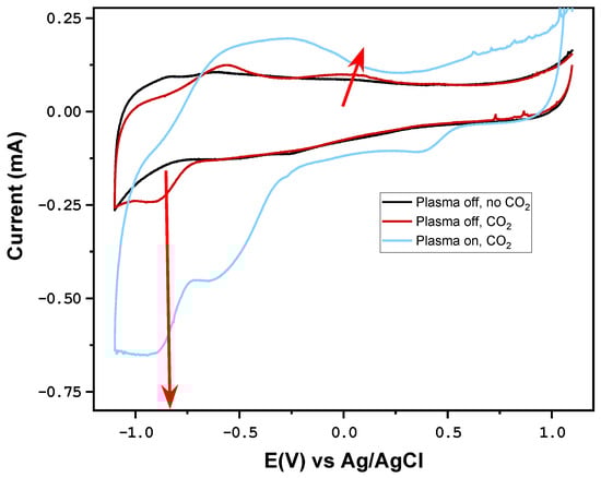 To investigate the impact of plasma discharge on electrochemical CO2RR, cyclic voltammetry (CV) was performed in a 0.5 M KHCO3 solution under three different conditions: without saturated CO2 and plasma, with saturated CO2 and no plasma, and with saturated CO2 and plasma. Figure 3 presents the CV curves from −1.1 V to 1.0 V vs. Ag/AgCl. In the absence of CO2 and plasma discharge, only the reduction peak corresponding to hydrogen evolution was observed (grey solid line in Figure 3). Upon purging CO2 into the electrolyte for 30 min, an additional reduction peak at −0.92 V emerged, indicating the CO2 reduction reaction (red and pink lines in Figure 3). However, this reduction peak appeared to shrink with increasing CV cycles, as shown in four consecutive CV scans. Two oxidation peaks at ~−0.51 V and 0 V appeared, possibly due to the oxidation of CO2RR intermediates.