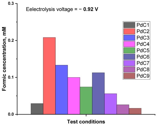 To assess the impact of plasma on CO2RR, the nonthermal plasma was ignited above the aqueous electrolyte immediately after the previous CV tests. Upon turning on the plasma discharge, we observed a drastic expansion of the cyclic voltammograms, i.e., the oxidation and reductions peaks augment in the direction, as indicated by the arrows shown in Figure 3. Particularly, the CO2RR peak at −0.92 V was greatly enhanced, suggesting that nonthermal plasma discharge facilitates electrochemical CO2RR. It is widely acknowledged that CO formation is inevitable during CO2RR [,]. The formed CO, which is bonded to the surface of the catalyst, blocks the active catalytic sites and diminishes the activity, resulting in low CO2RR performance, as demonstrated by the attenuated reduction peak at −0.92 V in the presence of CO2 but without plasma discharge. As discussed in the previous and a wealth of studies, such as reference [], nonthermal plasma discharge above an aqueous solution produces H2O2. In our discovery, the formed H2O2 by the nonthermal plasma discharge appears to be beneficial for electrochemical CO2RR, possibly owing to CO oxidation from the catalyst surface by the plasma-generated H2O2, therefore leading to more active catalytic sites for CO2RR. The capability of the nonthermal plasma discharge on the adsorbate removal and catalyst activation is corroborated by the nearly 2× enhancement in CO2 reduction current at −0.92 V. Recognizing that a voltage of −0.92 V is favorable for CO2 reduction, subsequent experiments used this specific electrolysis voltage. The electrolysis voltage refers to the applied voltage in the electrochemical CO2RR tests. Comparison of the produced formate concentrations from a series of experiments using the 10 wt% Pd/C catalyst at electrolysis voltage −0.92 V is illustrated in Figure 4. The bar graph illustrates the formic acid concentration (measured in millimoles per liter, mM) under different test conditions. These conditions vary based on the plasma conditions, plasma operating gas, and discharge mode, which are labeled from PdC1 to PdC9 (as shown in Table 1). The electrolysis voltage used in these tests is −0.92 V. PdC1, in which electrochemical nitrogen reduction occurs, serving as the control in the experiments. PdC2, when both electrochemical reduction and plasma discharge were conducted simultaneously, results in the highest formic concentration. As we move from PdC2 to PdC9, the bars sequentially decrease in height, suggesting a reduction in formic acid concentration. This graph provides insights into how the formic acid concentration varies with different electrolysis conditions and will be discussed in further context.