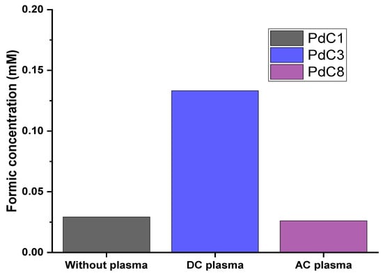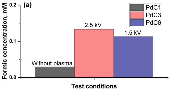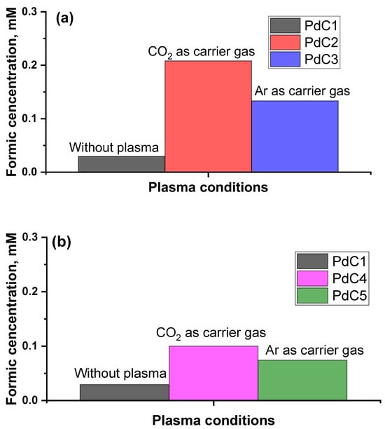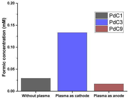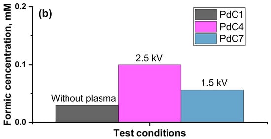 The production rates and faradic efficiency (FEformate) of the tests are detailed in Table 4. The highest FEformate, reaching 23.52%, was observed in the test utilizing high plasma voltage at 2.5 kV, CO2 as the carrier gas, 10 wt% Pd on carbon catalyst, and SEP mode (PdC4). The elevated plasma discharging facilitated the generation of more energy-reactive species, promoting CO2RR and enhancing FEformate. While some plasma-generated reactive species are short-lived and prone to decomposition or reactions with other compounds or molecules [], long-lived H2O2 from nonthermal plasma discharge fosters CO2RR. Surprisingly, the highest formate concentration was achieved under the condition of high plasma voltage at 2.5 kV, CO2 as the carrier gas, 10 wt% Pd on carbon catalyst, and SIM mode (PdC2). This suggests that a higher formate concentration does not necessarily equate to a higher formate faradic efficiency.