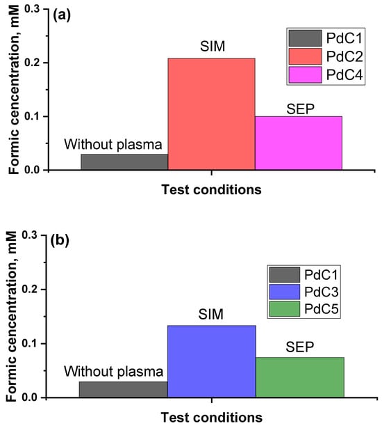 When the plasma operates at 1.5 kV (PdC6 and PdC7), it yields a higher formate production than the condition without plasma (PdC1, in the absence of plasma discharge). In addition, with an increase in plasma discharging voltage to 2.5 kV (PdC3 and PdC4), the concentration of formate production surpasses that observed at 1.5 kV (PdC6 and PdC7). This difference is attributed to the elevated plasma discharging voltage, leading to a greater generation of high-energy electrons within the electrochemical system. These electrons play a crucial role in the production of hydroxyl radicals and H2O2, which could facilitate reactivation of the catalyst [] and contribute to enhanced formate production. Furthermore, a comparison between Figure 5a,b at identical plasma discharge voltages reveals that when electrochemical CO2RR and plasma discharge occur simultaneously (SIM), CO2 reduction to formate is enhanced compared to when they occur separately (SEP, i.e., in sequence). This observation strongly implies a synergistic effect between plasma discharge and electrochemical CO2RR, a phenomenon that will be further explored in subsequent investigations.