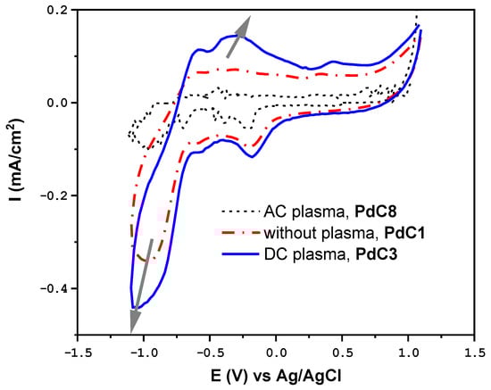 The comparison of CV curves for plasma electrochemical CO2RR at three different conditions (PdC1, PdC3, and PdC8): AC plasma, DC plasma, and in the absence of plasma. A 2.5 kV discharging voltage, simultaneously discharging mode, Ar gas, and Pd/C, were used in the experiments.