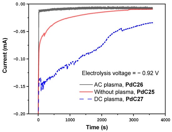 The chronoamperometry test results for plasma electrochemical CO2RR at three different plasma conditions (PdC1, PdC3, and PdC8): AC plasma, DC plasma, and in the absence of plasma. A 2.5 kV discharging voltage, simultaneously discharging mode, Ar gas, Pd/C, and −0.92 V vs. Ag/AgCl electrolysis voltage, were used in the experiments.