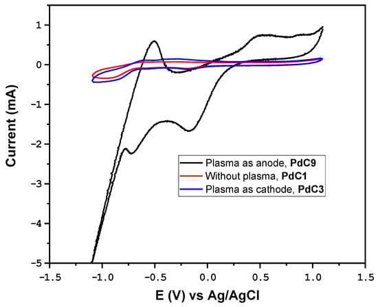 The comparison of CV curves for plasma electrochemical CO2RR at three different conditions (PdC1, PdC3, and PdC9). A 2.5 kV discharging voltage, simultaneously discharging mode, Ar gas, and Pd/C, were used in the experiments.