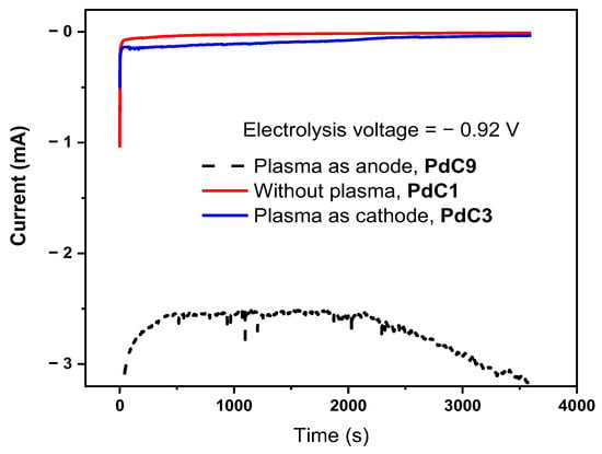 Chronoamperometry test results for plasma electrochemical CO2RR at three different conditions (PdC1, PdC3, and PdC9). A 2.5 kV discharging voltage, Ar gas as the plasma supply gas, Pd/C, and −0.92V vs. Ag/AgCl electrolysis voltage were used in the experiments.