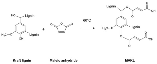 The modification of kraft lignin (KL), based on the method described by Chen et al. [26], involved adding 150 g of KL, pre-dried at 70 °C for 24 h, to a 10% maleic anhydride solution in acetone at a 1:20 (w/v) ratio in a round-bottom flask. The flask was immersed in a silicone oil bath maintained at 60 °C. Once the temperature stabilized, the mixture was magnetically stirred under reflux for 7 h. Figure 1 illustrates the esterification reaction of kraft lignin with maleic anhydride. Upon completion of the reaction, acetone was evaporated, and deionized water was added to precipitate the product. The precipitate was washed with distilled water at least five times, vacuum-filtered, and dried at 80 °C for 24 h. The dried product was subsequently ground into a fine black powder. The final product is called MAKL.