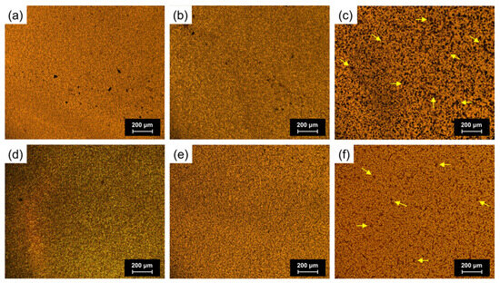 Optical micrographs of PP with lignin: concentrations of 2.5, 5.0, and 10.0 wt% of KL (a–c) and MAKL (d–f). Yellow arrows highlight some pronounced aggregation.