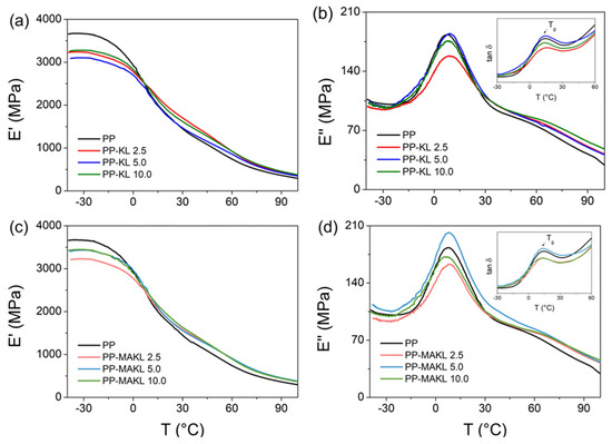 E′ and E″ curves of the (a,b) PP-KL and (c,d) PP-MAKL. The insets display the tan δ curves as a function of temperature, which identify the Tg of the blends.