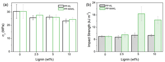 (a) Yield stress (σy) and (b) impact strength of PP-KL and PP-MAKL samples.
