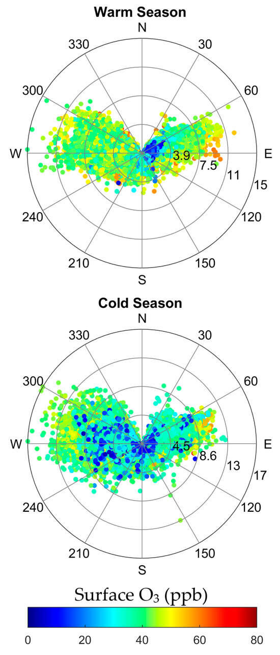 Warm (top) and cold (bottom) variability of O3 concentrations measured at LMT based on wind directions and speeds.
