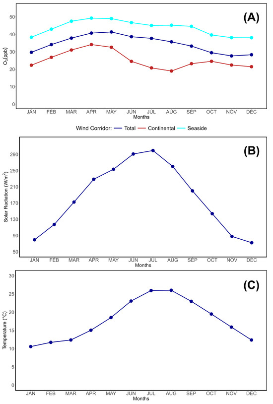 Monthly variability of O3 ((A), ppb), solar radiation ((B), W/m2), and temperature ((C), °C) at the LMT site. O3 data are differentiated per wind corridor: continental (0–90 °N); seaside (240–300 °N), and total, accounting for all wind directions, including those falling outside the continental and seaside filters.