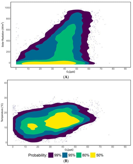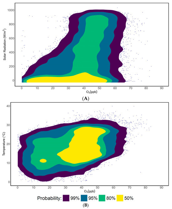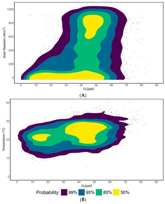 Density distribution plots of O3 with solar radiation ((A), W/m2) and temperature ((B), °C). These plots consider the cold season (October–April) only.