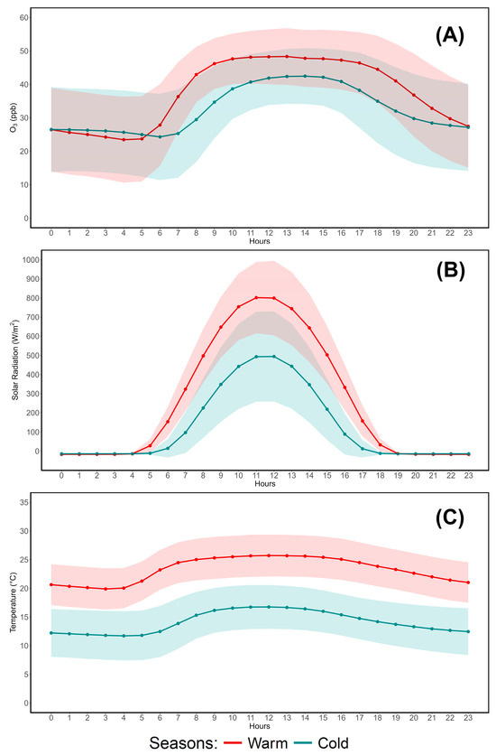 This analysis of the daily cycle shows that seasonal differences in solar radiation and temperature are very well defined; however, O3 has a hybrid behavior, with diurnal hours yielding higher warm-season concentrations, while early morning concentrations are reportedly higher during the cold season.