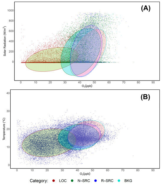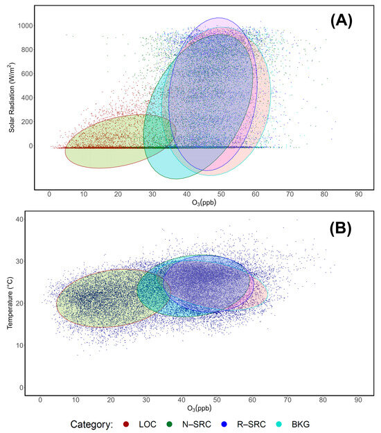 Density distribution plots of O3 with solar radiation ((A), W/m2) and temperature ((B), °C). These plots consider the warm season (May–September) only.