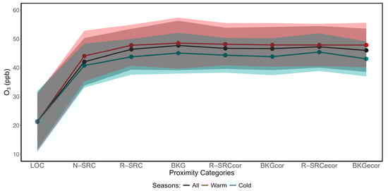 From the computed data ellipses, it is possible to notice that the LOC category is systematically linked to lower O3 concentrations under all circumstances, and is very well differentiated from the others. Following the same methodology applied to previous studies [99,100], average concentrations of O3 have been calculated depending on proximity categories, both standard and corrected. The results are reported in Table 9 and Figure 10.