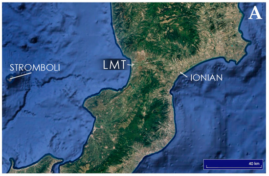 Located 600 m from the Tyrrhenian coastline of Calabria (Italy), the Lamezia Terme (code: LMT; Lat: 8°52.605′ N; Lon: 16°13.946′ E; Elev: 6 m AGL) (Figure 1A) observation site is part of the World Meteorological Organization—Global Atmosphere Watch (WMO/GAW) network and is fully operated by the National Research Council of Italy—Institute of Atmospheric Sciences and Climate (CNR-ISAC). The observation site is located in the industrial area of the Lamezia Terme municipality, within the province of Catanzaro. With a distance of ≈32 km between the Tyrrhenian and Ionian coasts of the region, LMT is located in the westernmost sector of the narrowest point in the entire Italian peninsula, the Catanzaro isthmus. The isthmus effectively separates the Sant’Eufemia plain, where the observation is located, from southern (Serre Massif) and northern (Coastal Chain, Sila Massif) mountain ranges [108,109]. As a result of this peculiar geomorphological framework, near-surface winds are channeled through the isthmus [110], exploiting the depression caused by tectonics [111,112,113,114,115,116,117]. In the early Quaternary period, the isthmus accommodated a tidal strait directly connecting the two seas, as evidenced by local outcrops showing structures linked to 3D and 2D dunes [118,119,120].