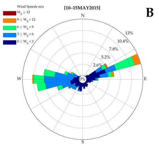 The unique geomorphological and orographic framework of the Catanzaro isthmus (Figure 1B) compared to the rest of the Italian peninsula allows near-surface wind circulation to be well oriented on a preferential W/NE axis as observed by the LMT observatory itself (Figure 1C). Wind patterns are influenced by seasonal variability, breeze regimes, and eastern/western synoptic conditions, and have also shown vertical gradients reflecting large-scale circulation in the area and local orography [132,133,134,135,136,137]. Breeze regimes were proven to be a key regulator of local climate and wind circulation, with seasonal variations also being reported; however, a primary W-WSW/NE-ENE axis dominates near-surface circulation, as a consequence of local orography. When considering the 850 hPa layer, however, large-scale flows in the area dominate with a preferred NW direction [132]. During most of the cold months, specifically between November and February, large-scale forcing regulates diurnal wind circulation patterns; the March–October period is characterized by nighttime flows connected to nocturnal breeze regimes, and diurnal breezes resulting from both large-scale and local flows [133].