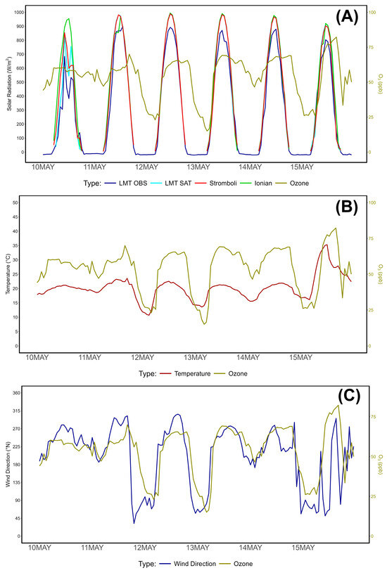 Correlation of hourly surface O3 with parameters measured at the LMT site (temperature, solar radiation—LMT OBS), and DSSF products (LMT SAT, Stromboli, Ionian).