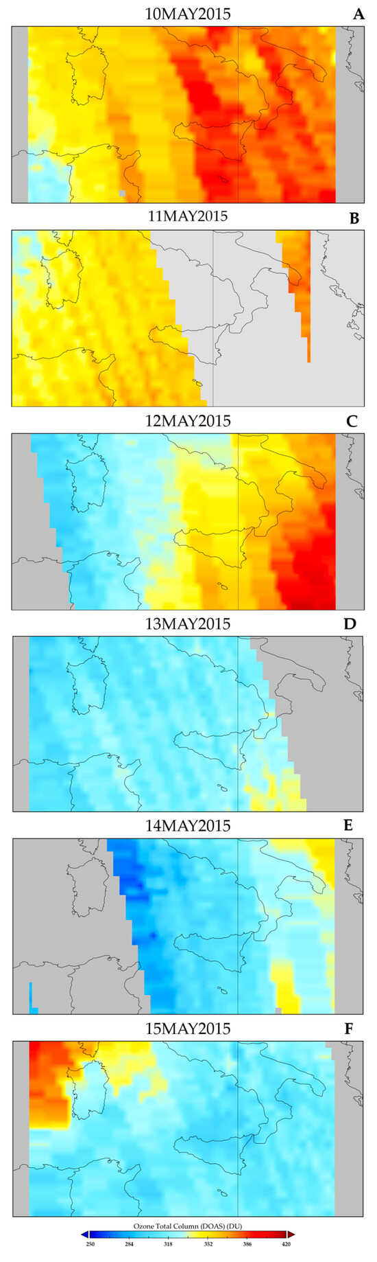 Finally, available OMI products have been used to evaluate the CS on a large scale and monitor its evolution over time. OMI data are shown in Figure 13; data from 11 May referring to LMT and other regions of Calabria are not available. Overall, an air mass transport phenomenon from the west is reported. These products cannot be directly compared with surface measurements at LMT; however, they have the advantage of showing tropospheric O3 variability over a wide area, with a focus on the Tyrrhenian.