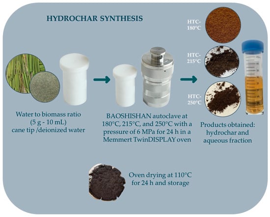 For this study, biomass residues from sugarcane tips (STs) were treated with hydrothermal carbonization to produce hydrochar (HTC). For the hydrochar preparation process through hydrothermal carbonization, hydration conditions, temperature, and residence time must be considered; water provides an excellent medium for heat transfer in exothermic reactions [10]. The hydrothermal carbonization process involves the application of high temperatures (180 °C to 250 °C) and pressure (2 to 10 MPa) to convert biomasses into carbonaceous materials. It can utilize organic waste with high moisture contents (70–90%) without the need for pre-drying, thereby reducing energy costs. The resulting solid material has applications in the remediation of contaminated water, soil improvement, and bioenergy production [11,12]. Hydrochar obtained from the hydrothermal carbonization of sugarcane tips is used as an option for sustainable use and removal of heavy metal contaminants from water.