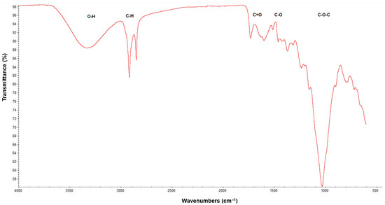 In the spectrum, a broad band around 3300 cm−1 is observed, corresponding to O–H stretching vibrations from carboxylic groups located between 3490 and 3175 cm−1, which are involved in intramolecular hydrogen bonding in cellulose. The bands in the 2850–2950 cm−1 region are related to C–H stretching vibrations present in cellulose molecules. The IR spectrum shows a C=O stretching band at 1750 cm−1, associated with acetyl and ester linkages such as lactones in lignin and hemicellulose, as well as a C–O stretching band at 1250 cm−1 due to aryl groups in lignin, associated with phenolic structures [35]. The pronounced transmittance band at 1040 cm−1 can be attributed to C–O–C stretching vibrations, which are characteristic of carbohydrate–lignin linkages [22,36].