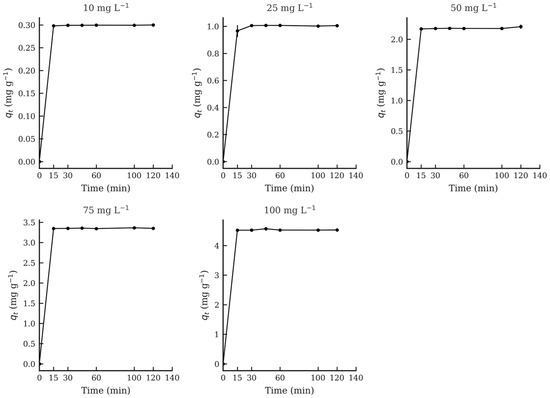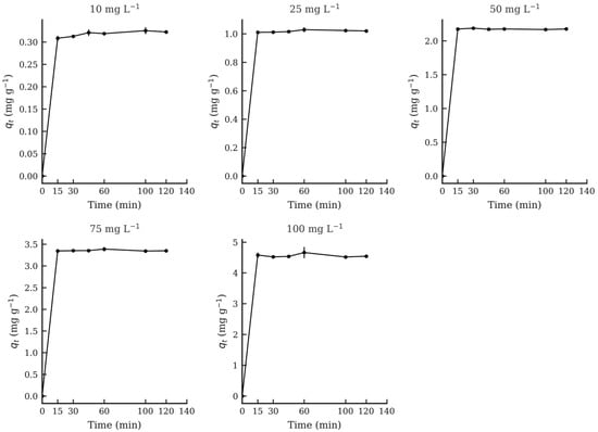 In all cases, equilibrium was reached rapidly—within 15 min or less—as indicated by the stabilization of qt values over time. At an initial concentration of 100 mg L−1, the highest equilibrium uptake was observed for the hydrochar synthesized at 180 °C (4.90 mg g−1), followed by 4.58 mg g−1 and 4.52 mg g−1 for 215 °C and 250 °C, respectively (Table 3). These values confirm the superior performance of the 180 °C material in terms of adsorption capacity and kinetics. Time-course adsorption profiles are shown in Figure 4 for the 180 °C material, with corresponding profiles for the 215 °C and 250 °C materials presented in Figure 5 and Figure 6, respectively.