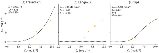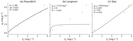 The Sips isotherm (Langmuir–Freundlich) describes adsorption on energetically heterogeneous surfaces. In the Sips equation, qe (mg g−1) is the adsorbed amount at equilibrium and Ce (mg L−1) is the equilibrium concentration. The parameter qmax (mg g−1) denotes the monolayer capacity; Ks (L mg−1) is the affinity constant; and n (dimensionless) is the heterogeneity factor. When n = 1, Sips reduces to Langmuir (homogeneous surface, monolayer). Deviations n ≠ 1 reflect surface heterogeneity [30,31].
