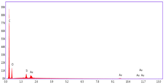 Analysis of the spectrogram shown in Figure 12 determined that the average amount of carbon (C) present in the hydrochar was 70.26%, oxygen (O) 23.70%, silicon (Si) 1.30%, and gold (Au) 4.75%, the latter element due to the coating used for electron detection. It is important to note that the presence of silica in the hydrochar can influence the porous structure of the material, helping to form a more stable and resistant porous matrix, which can improve adsorption properties. In biomasses such as rice husk, sugarcane residue, or wheat straw, which are commonly used to produce hydrochar, the silicon content is particularly high due to the accumulation of silica in the plant from silicate-rich soils [1].