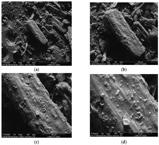 Photomicrographs of the sugarcane tip hydrochar (ST HTC 180 °C) after Pb2+ adsorption at different magnifications: (a) 250×, (b) 500×, (c) 1000× and (d) 2000× Section 2.