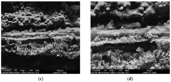Photomicrographs of the hydrochar (ST HTC 180 °C) of the sugarcane tip at different magnitudes: (a) 250×, (b) 500×, (c) 1000× and (d) 2000× Section 2.