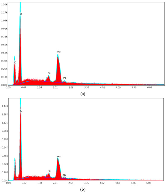 Figure 15a,b shows the spectrograms of the adsorbents with the presence of lead analyzed in duplicate by HTC at 180 °C, where the corresponding signals of the various elements are observed: C, O, Si, Au, and Pb. The presence of the lead was confirmed in both EDAX runs.