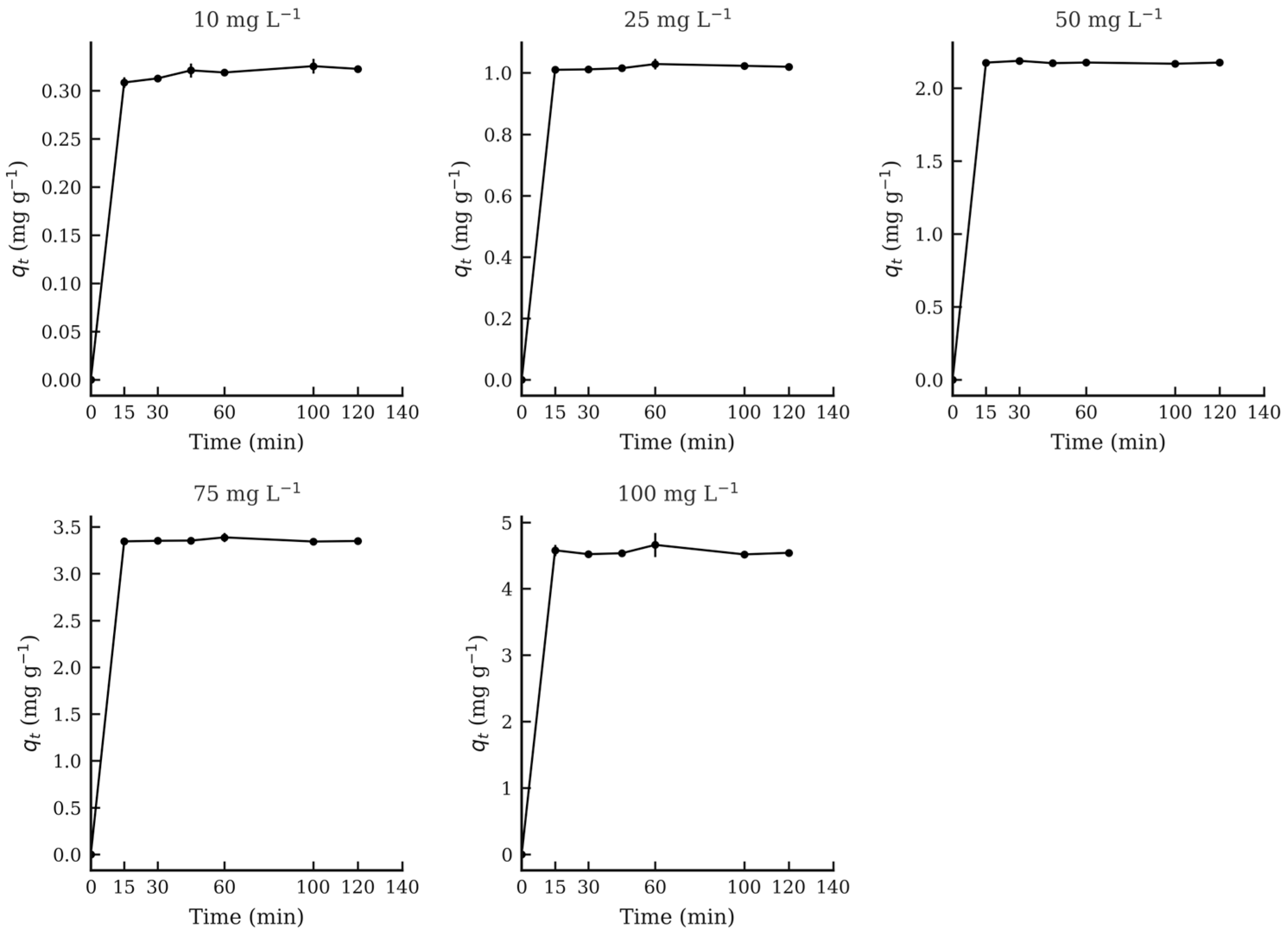 | ST HTC (°C) | C0 (mg L−1) | Ce (mg L−1) | qt (mg g−1) | ST HTC (°C) | C0 (mg L−1) | Ce (mg L−1) | qt (mg g−1) | ST HTC (°C) | C0 (mg L−1) | Ce (mg L−1) | qt (mg g−1) |