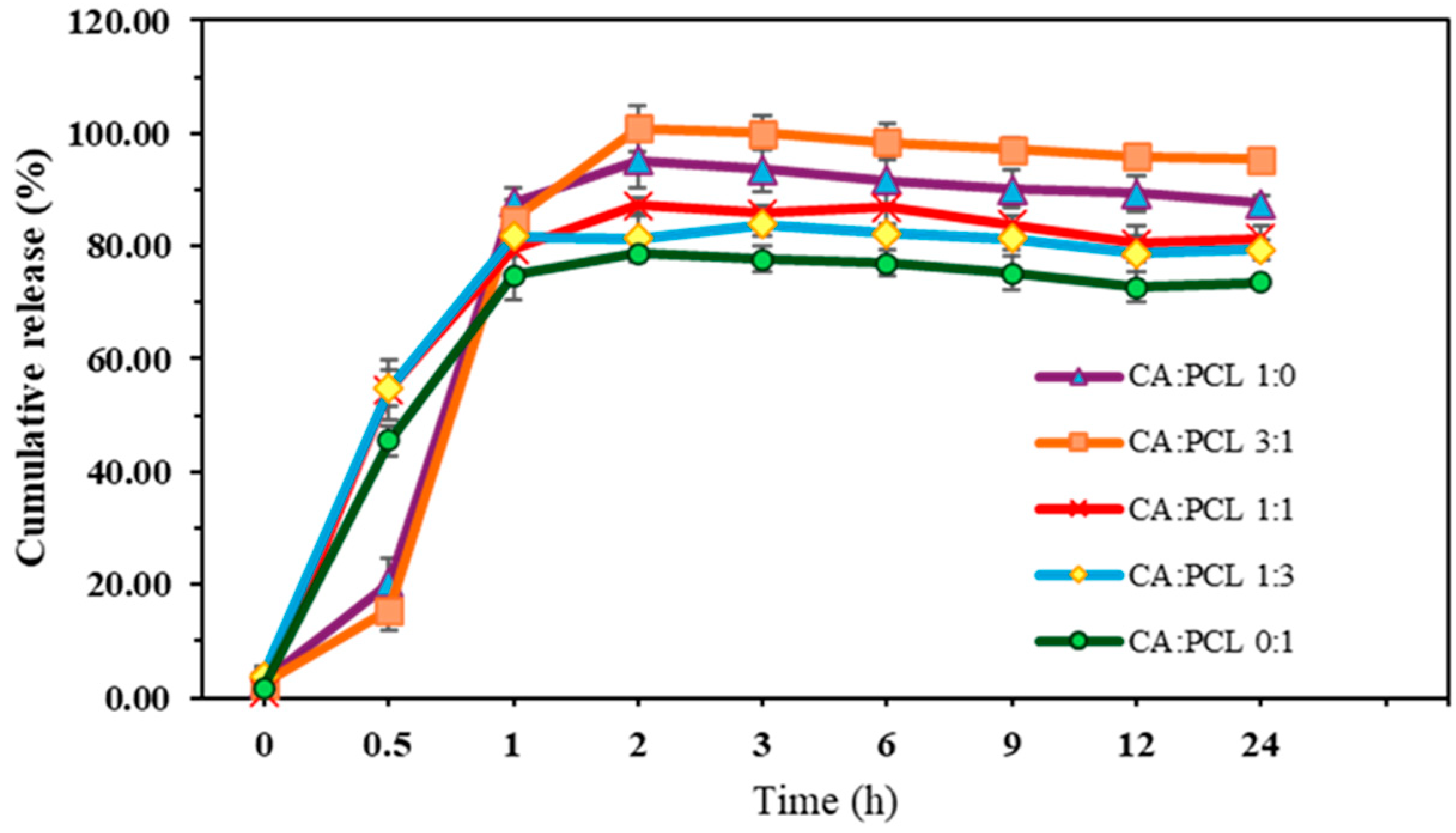 3.3. In Vitro trans-Oxyresveratrol Release of trans-Oxyresveratrol-Loaded CA-PCL Fiber Sheets