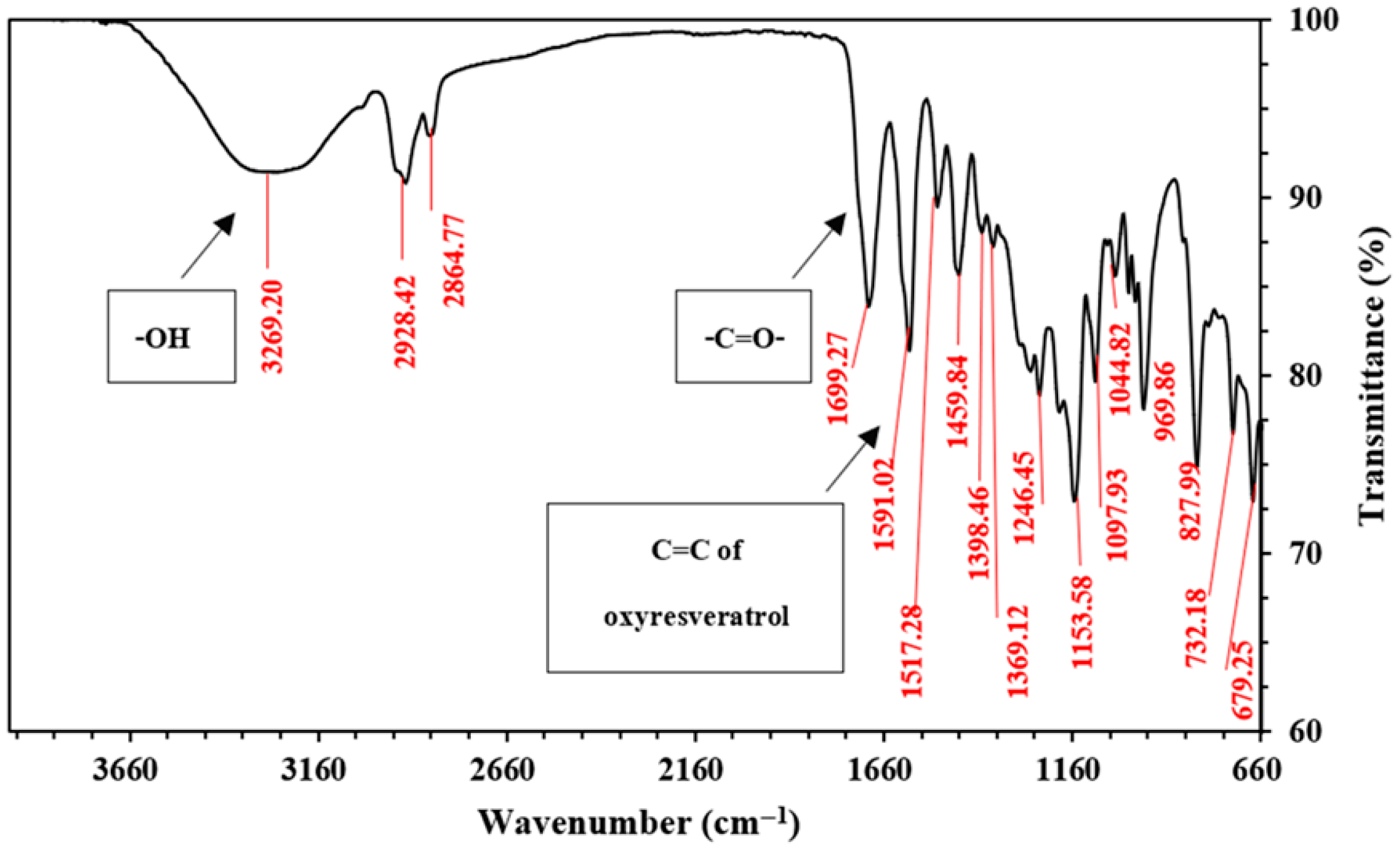 3.4. Proving the Structural Identity of Oxyresveratrol from CA-PCL Nanofiber Sheet Using the FT-IR Technique