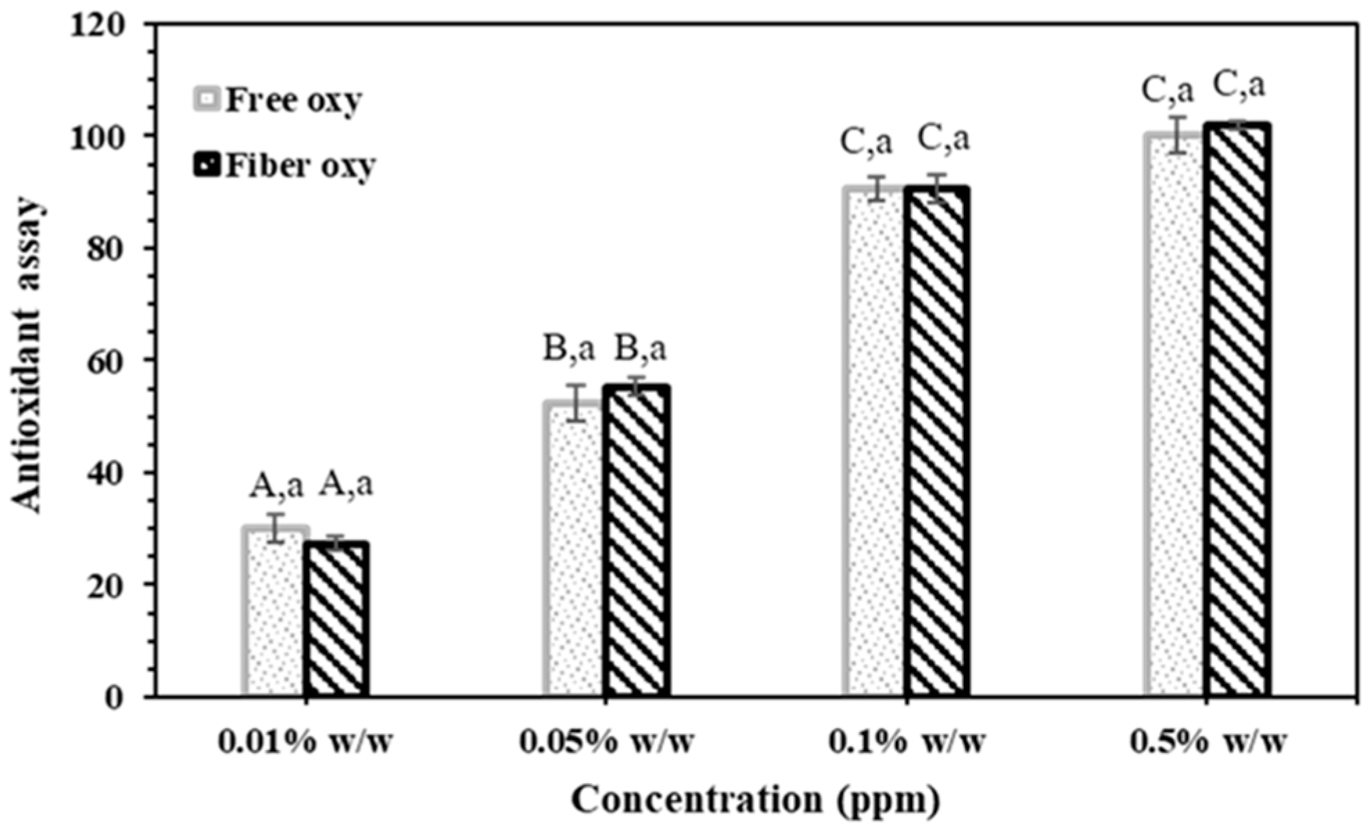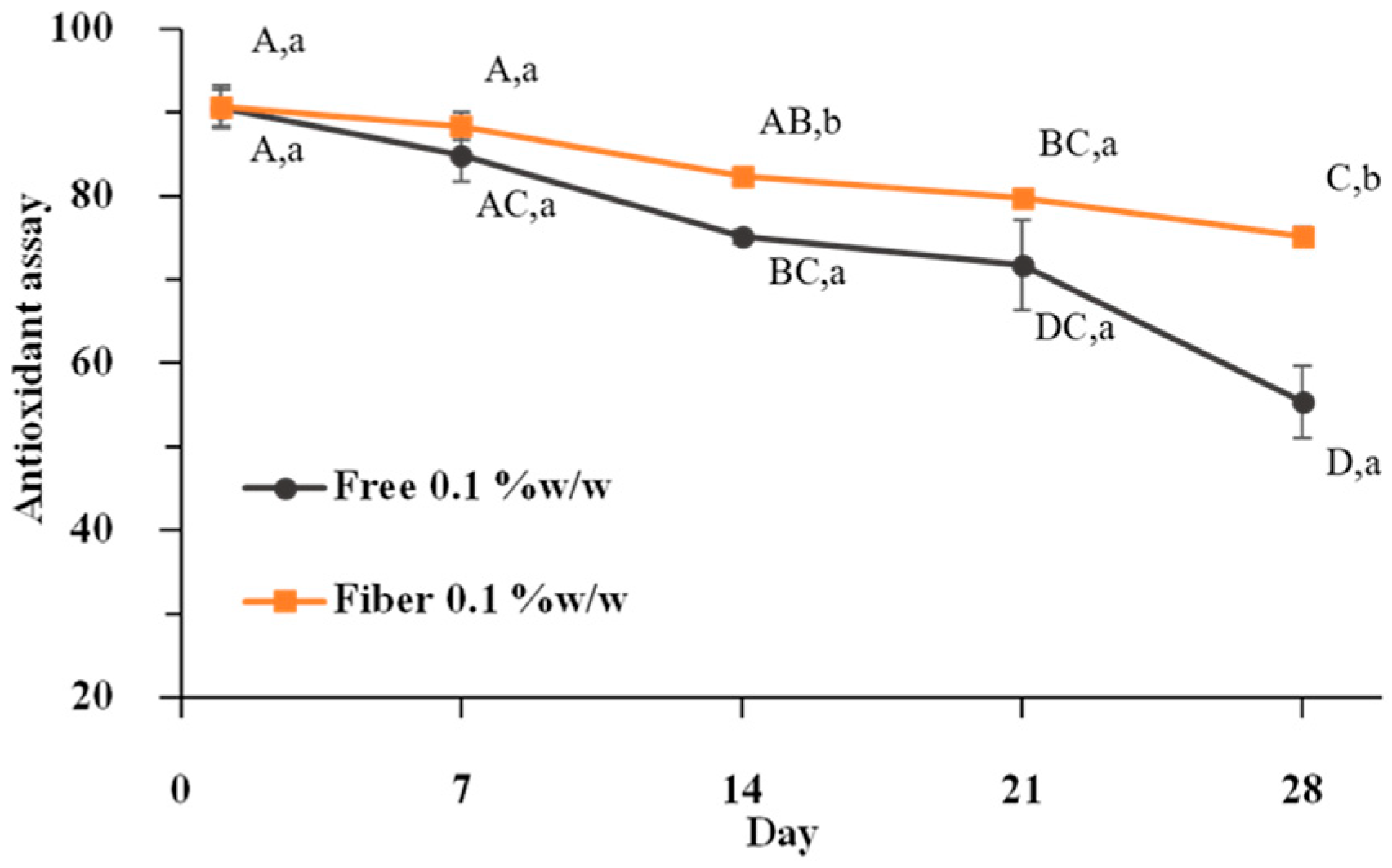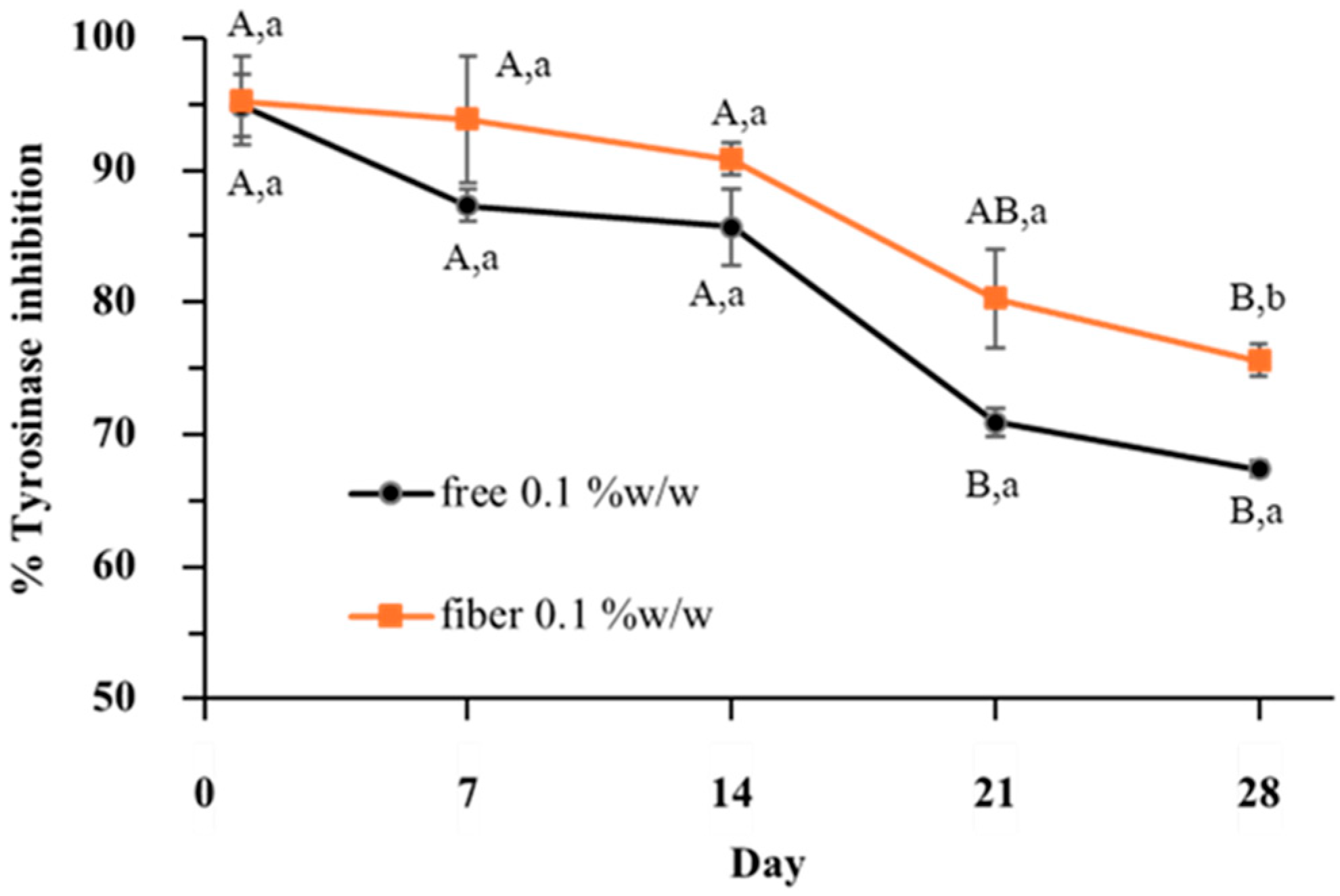 3.11. Study of the Inhibitory Effect on Tyrosinase Enzyme of Oxyresveratrol Encapsulated in Fibers Under Accelerated Conditions Compared to Free Oxyresveratrol at the Same Concentration