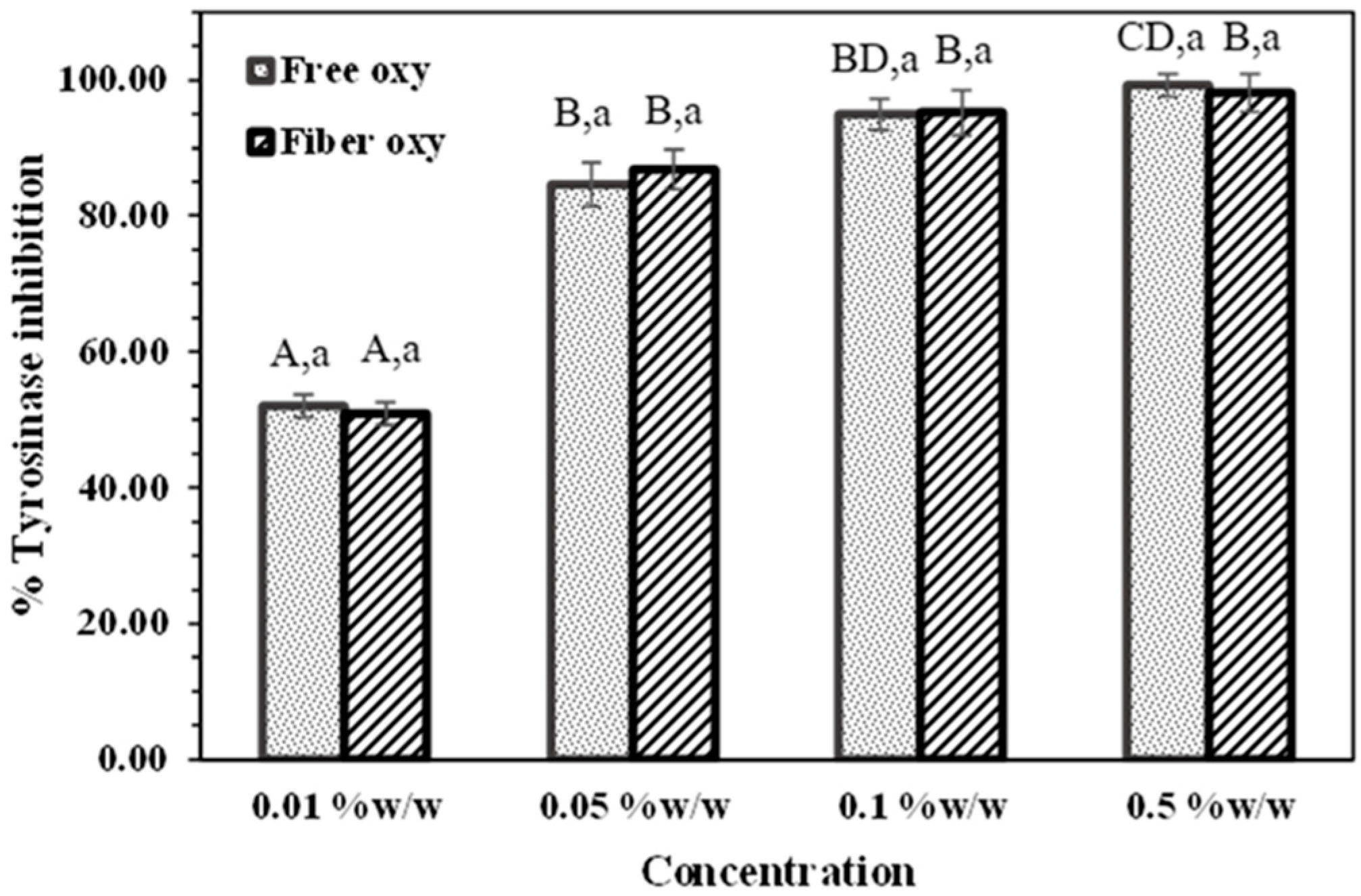 3.10. Study of the Tyrosinase Inhibitory Activity of Fiber-Encapsulated Oxyresveratrol Compared to Free Oxyresveratrol at the Same Concentration