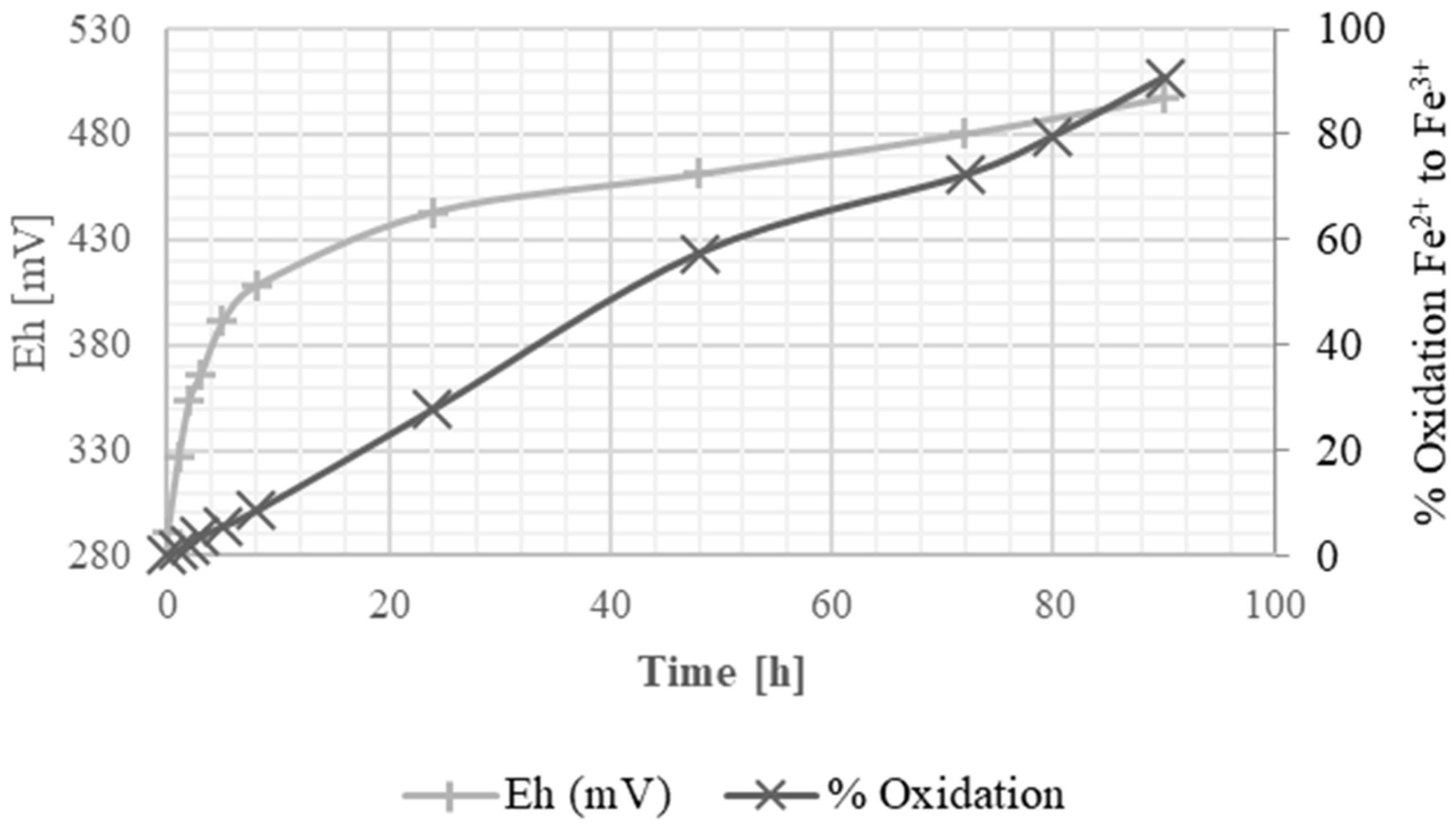 The progression of Fe2+ oxidation was monitored by titration with 0.1 N potassium permanganate (KMnO4) at 1, 2, 3, 5, 8, 24, 48, 72, 80, and 90 h. For each measurement, a 1 mL aliquot of the solution was titrated until a pale pink endpoint was reached. Once the maximum oxidation was achieved, the regenerated solution was recirculated in a second leaching cycle to assess copper recovery.