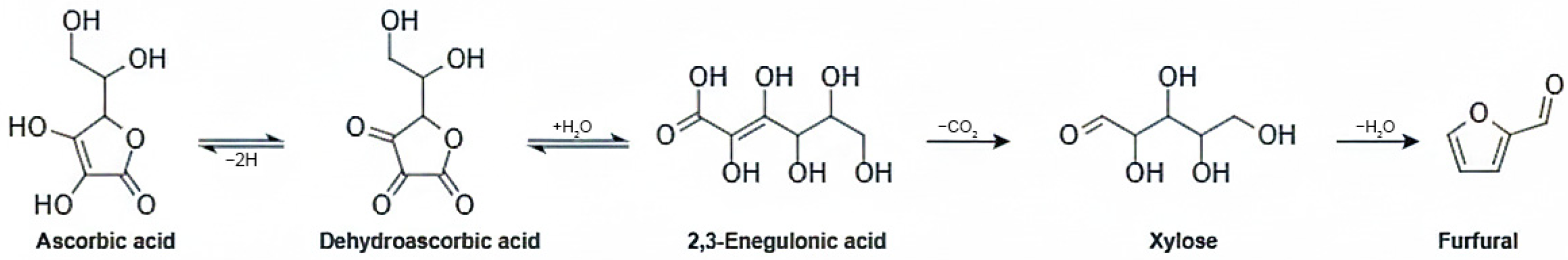 - Agcam, E. A Kinetic Approach to Explain Hydroxymethylfurfural and Furfural Formations Induced by Maillard, Caramelization, and Ascorbic Acid Degradation Reactions in Fruit Juice-Based Mediums. Food Anal. Methods 2022, 15, 1286–1299. [Google Scholar] [CrossRef]