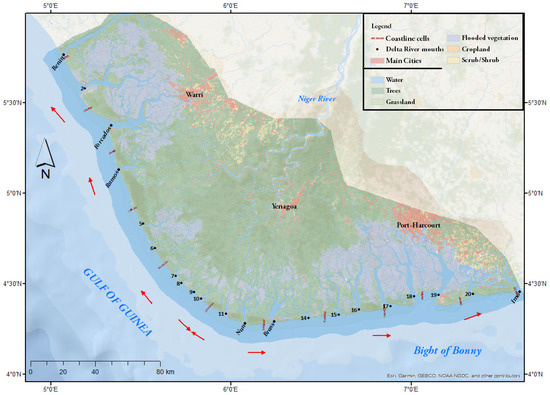 - Adegoke, O.; Fageja, J.; James, M.; Agbaje, G.G.; Ologunorisa, E.T. An Assessment of Recent Changes in the Niger Delta Coastline Using Satellite Imagery. J. Sustain. Dev. 2010, 3, 277–296. [Google Scholar] [CrossRef]