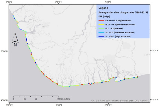 The dominant temporal pattern of shoreline movement during the successive epoch periods oscillates between an initial period of greater shoreline accretion (1986–2003) to greater shoreline erosion (2003–2011), back to greater shoreline accretion (2011–2015), and finally to greater shoreline erosion (2015–2019). Kuenzer et al. [32] similarly report dominant accretion along the Niger delta between 1986/87–2002/03 but greater erosion between 2002/03–2013. Moreover, shoreline erosion during the period leading to 2011 was partly induced by Niger River dredging, while the shoreline accretion of the 2011–2015 may have been significantly propelled by the ‘great’ 2012 floods within the Niger River basin, according to Dada et al. [28].