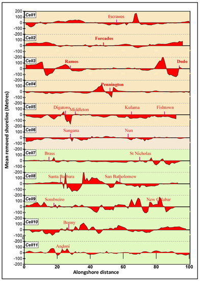 We employed the temporal mean-removed shoreline as a mathematical approach to characterise the most entrenched pattern of shoreline change within the distinct coastline cells. The mean-removed shoreline was determined by computing the cumulative average shoreline change during the successive epoch periods at individual alongshore transects. The concept was originally employed by Hapke et al. [9] as an approach to reveal the persistent trends in shoreline dynamics over time. The authors computed a time series of historical shorelines whose overall mean was subtracted from each observed shoreline position, such that positive values within an epoch are indicative of seaward shoreline advance, while negative values indicate landward shoreline movement [9]. This method was adapted in the present study to, among others, highlight the overall mean position of the shoreline at individual alongshore transects, ascertain the pervasive trend of shoreline change, and highlight the magnitude of the shoreline movement during period of study. We derived the mean-removed shoreline (m − s) using the notation: