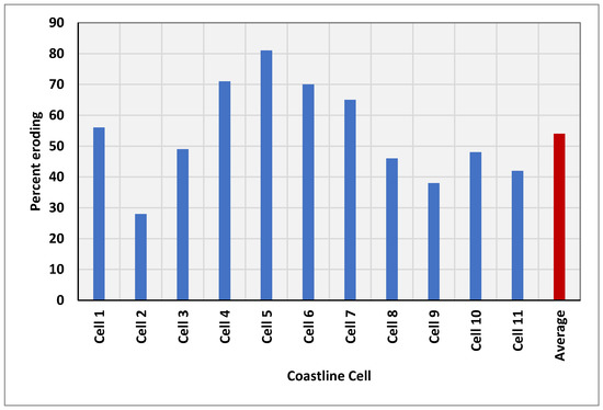 The percentage of eroding transects across the coastline cells of the Niger delta computed from the mean-removed shorelines. The centrally located coastline cells (cells 4–7) contain a higher number of eroding transects than the coastline cells on the opposing delta flanks.