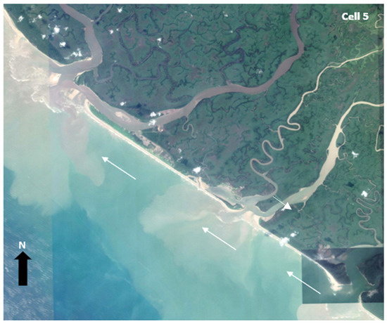 The location of the erosion hotspot (Figure 2) seems to coincide with the point where the shoreline orientation changes from a west-east trend to a northwest-southeast trend. Wright and Coleman [6] claimed that coastline convexity tends to maximize wave erosive power, a factor likely to be critical in the entrenched shoreline recession within the coastline cell 5 (Figure 4). This suggestion is supported by the unusually high significant wave height (Hs > 2 m) previously reported between Sangana and Fishtown Rivers (i.e., between cells 5 and 6 [30,37]. Cells 5 and 6 also have a region of alongshore drift reversal, in which the regular northwest trending longshore drift occasionally changes into a southeast trend ([37], Figure 1). Such longshore drift reversal could potentially result in a net loss of sediment to the offshore environment, as has been inferred from a similar alongshore drift collision in the margin of the western Niger delta [63]. We also noted cell 5 as the coastline cell with the greatest number of delta distributaries (Table 3; Figure 6), which tend to intensify coastline processes [32].