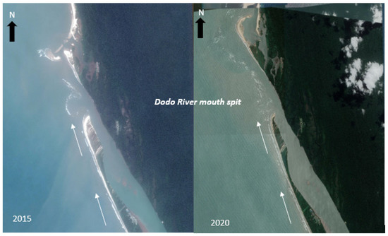 Coastline dynamics around the Dodo River mouth spit as observed in the satellite images of 2015 (left) and 2020 (right). Longshore drift trend is indicated by the white arrows. [Landsat images courtesy Google Earth].