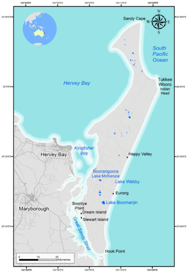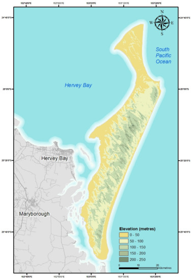 K’gari lies in the subtropics off the eastern coast of Australia between 24 and 26° S and is one of 8411 offshore Australian islands [3]. It is the largest and northernmost of a chain of prominent barrier islands off the southeast coast of Queensland, formed by South and North Stradbroke Island (Curragee and Minjerribah) and Moreton Island (Moorgumpin). K’gari is frequently cited as the “largest” sand island globally [4], being ca. 130 km long, 25 km wide, encompassing 1660 km2, and having a maximum elevation of 277 m a.s.l. [5,6].