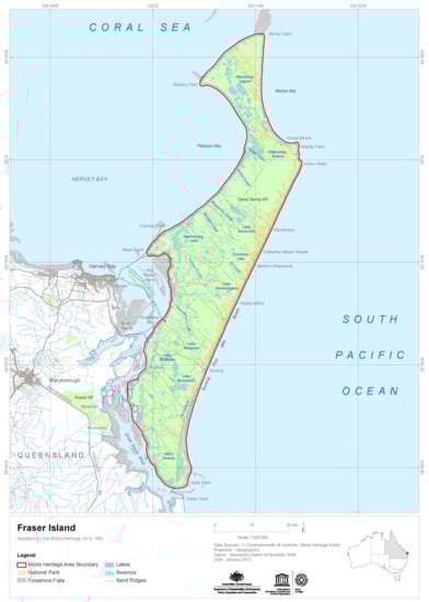 The outstanding natural value of K’gari was recognized by the United Nations Educational, Scientific, and Cultural Organization (UNESCO) and inscribed on the World Heritage List in 1992 [7], primarily on account of its wilderness character and the diversity of ecosystems. Amongst features emphasized in the World Heritage listing are the long expanses of ocean-exposed beaches and high-energy surf zones; the combination of shifting sand dunes and tropical rainforests; the presence of half of the world’s perched freshwater dune lakes; and the world’s largest unconfined aquifer on a sand island [8]. Significantly, K’gari also lies within a biosphere (the Great Sandy Biosphere) and is unique in that it adjoins another biosphere (the Noosa Biosphere).