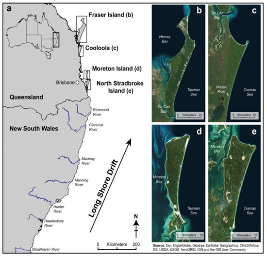Figure 3. Longshore drift effects on southeast Queensland coast. Panel (a) shows the location of these dune fields. Panels (be) are satellite images of K’gari (b), Cooloola Sand Mass (c), Moreton Island (d), and North Stradbroke Island (e) [38].