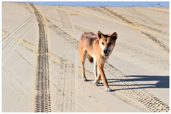 Figure 9. K’gari dingo (wongari) on the beach [96]. Reprinted with permission from McKay 2019.